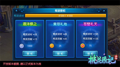 3.帮派祭祀:每天可祭祀一次,有三种祭祀类型可选,第一种酒沣祭之需要1000银子,第二种黄琮礼地需要25金子,以及苍壁礼天需要75桃心,祭祀后会获得相应的帮贡。