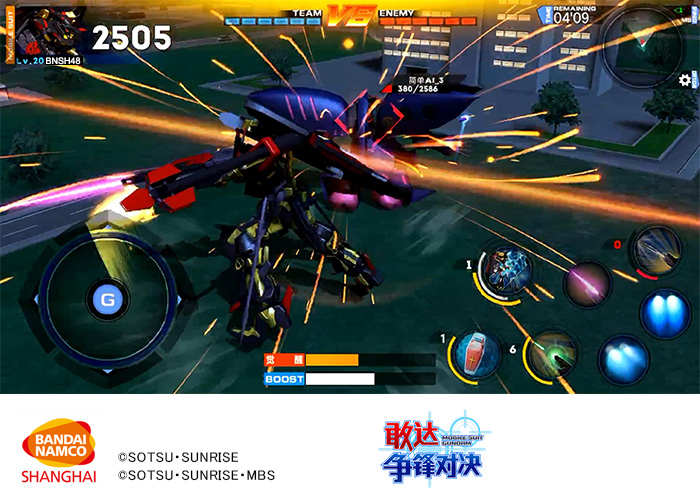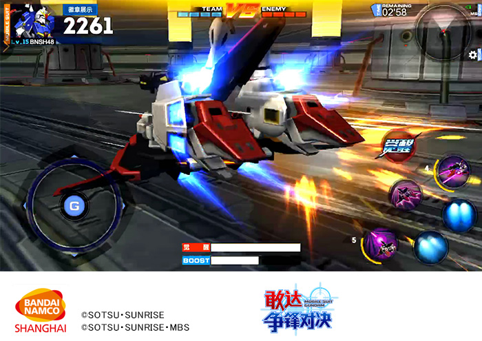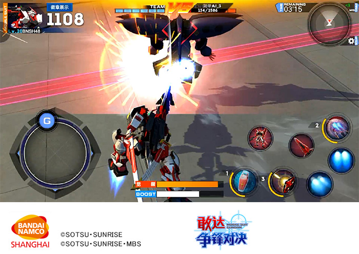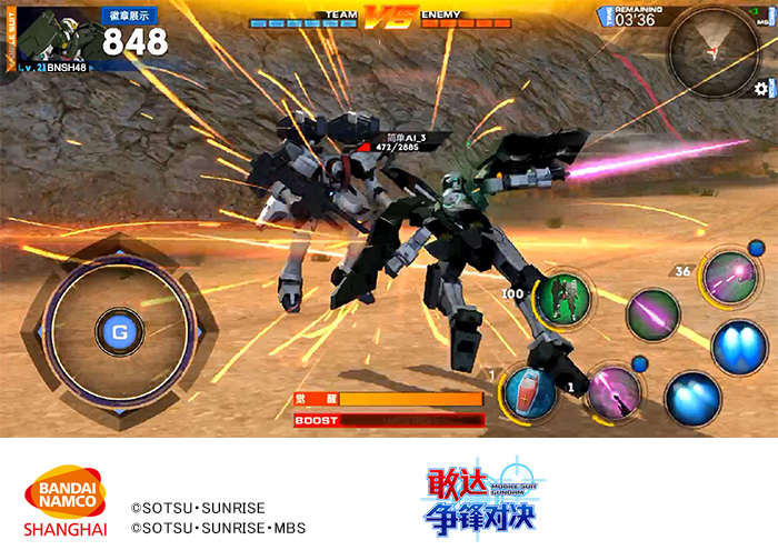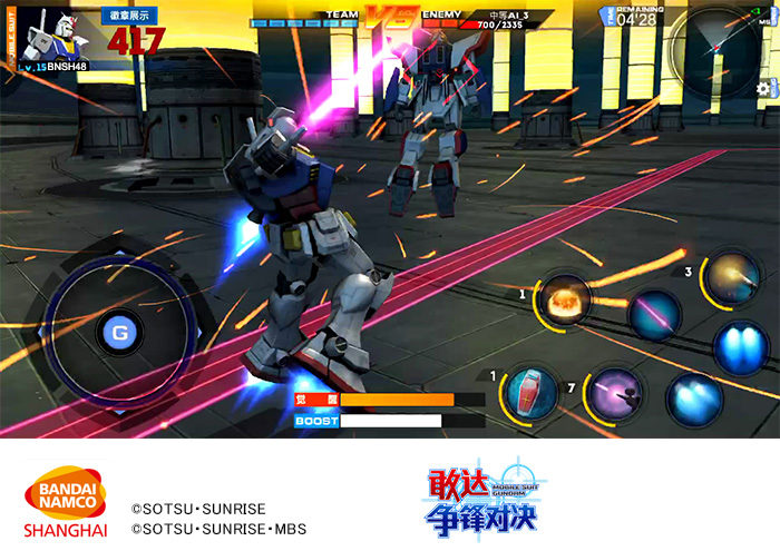 在《敢达争锋对决》之中,使用格斗武器来攻击对手,也是能够形成巨大伤害的手段。通过按压屏幕上的虚拟按键「普通格斗键」,可令机体施展出专属的格斗攻击动作。根据机体的不同,搭配方向键「左or右」或者「喷射键」,更有「横向格斗」、「冲刺格斗」等丰富的格斗招数。