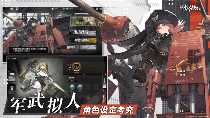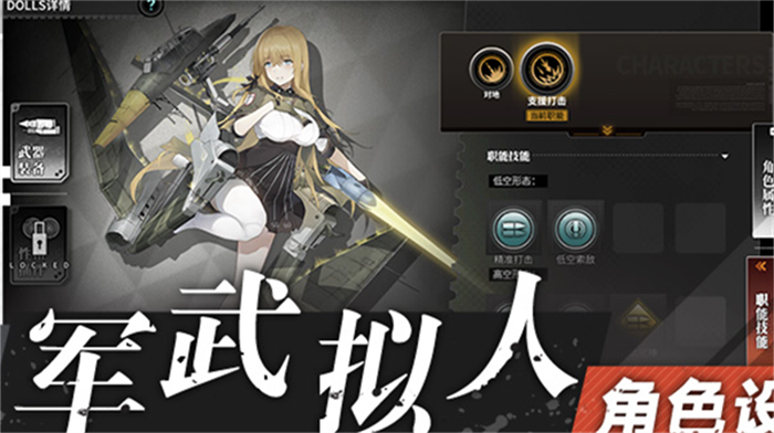2、实装了包括坦克、对空炮、战斗机等7个兵种,近百位属性技能各异的兵装少女“dolls”。通过巧妙的组合策略,组成实力强劲又极具个性化的武装少女战队!