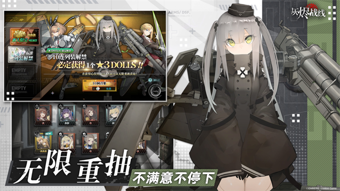 4、开局就有超级福利,免费十连,不满意,即可无限重抽!不再需要建多个初始号刷角色,直接新手免费10连后,可以保留或重抽,直到那个你最想拥有的DOLLS!