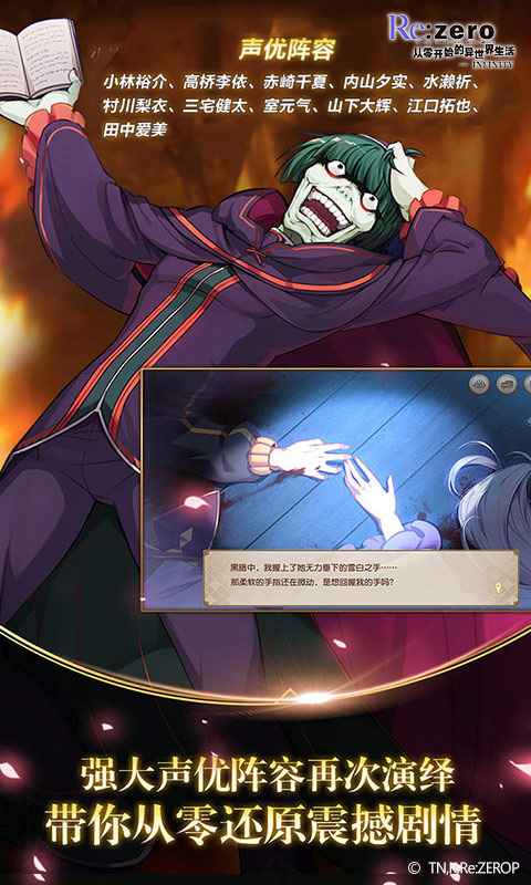 《Re:从零开始的异世界生活无限》手游保留动漫的精髓,1:1复刻还原人物、场景和剧情,并邀请动漫cv的原班人马为人物、剧情做全新的配音,在视觉和听觉感受上都达到完美还原。另外手游还将在原作剧情基础上,加入全新的番外、支线剧情,玩法上更注重剧情的代入感和人物养成要素。