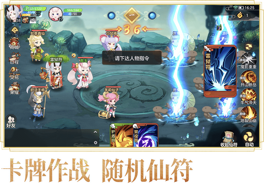 PVE随机触发获取仙符,战场局势瞬息万变,策略体验趣味横生,奴役、神愈、嘲讽、雷狱……,百变效果助力逆风翻盘。
