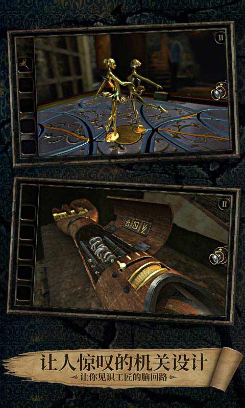 《迷室3手游》游戏延续了前两座的高难度逻辑题目设定和阴森恐怖的环境气氛,设置一系列围绕“盒子”玩法来解开场景中的各种机关谜题,亦可像前作那样使用特殊镜片来进行解谜,充分利用触屏设备的特性打造移动平台专属的解谜体验,官方表示该作将会是《迷室》系列的集大成之作。