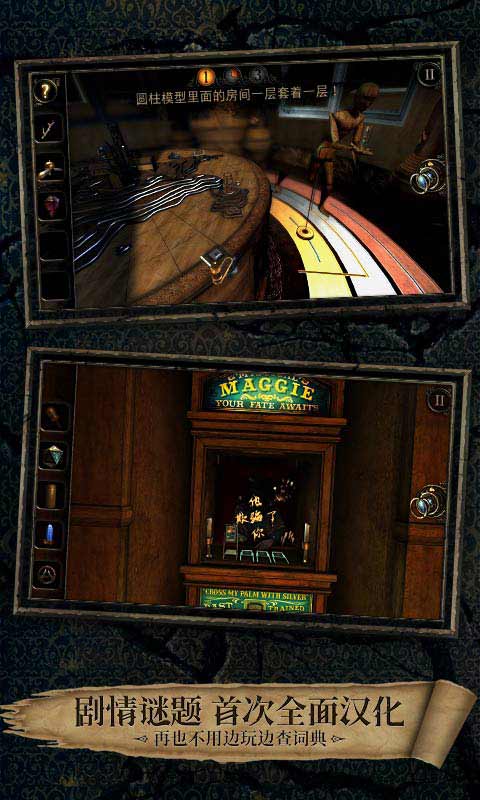 《迷室3手游》在新手教程和提示上并没有特别突破点,目镜依旧是玩家破解谜题的最好帮手。相比前两作品,游戏内容上新增了一些难题和新的游戏场景,想必玩家要花费更多的心思去解谜。开始时玩家眼前会出现了一个摆放着巨大的西洋镜的桌子,位于正中央的教堂很抢眼,中间空出的大块区域表明了缺失的建筑物。前进方向一直都围绕着桌子在打转,很快就发现了一个隐藏隔间。