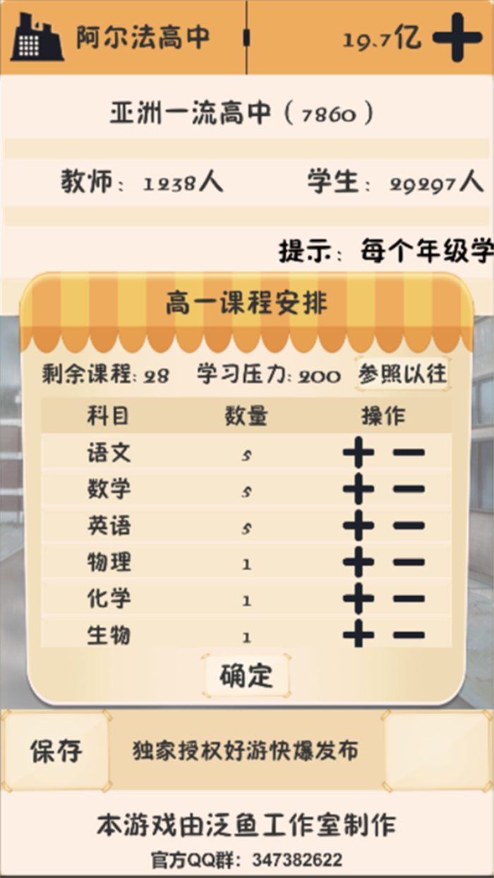 6.到了五六年手上开始有点钱了,开始搞建筑。学习质量和作业补课政策有关,和老师质量有关,有上限。压力可以吃建筑,多弄几个宿舍,压力就下去了。这时候可以补课加作业,没错就是这么丧心病狂。每日增长削减下来之后,一个学期下来也不会逃课大家,出游运动会开展与否全看心情