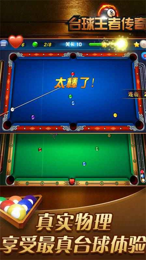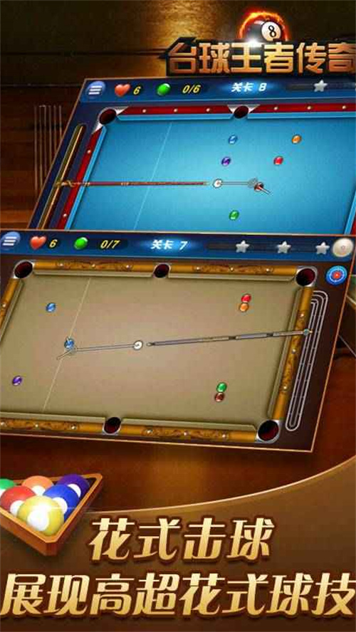 台球王者是一款休闲的台球闯关游戏。真实的物理,给你最真实的线上台球体验!完美还原现实8球玩法,简单流行的操作方式,绚丽的动画特效,配以真实的物理参数,精准的进球,激动人心的赛事,究竟谁才是冠军?让我们拭目以待。上千关卡,精心策划,快来体验花式台球解谜的快感吧!