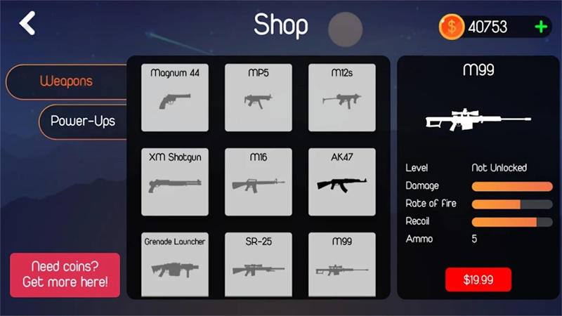 3.你可以在关卡中去获得丰富的战斗武器,利用每次战斗所获得的金币来提升武器的攻击能力;