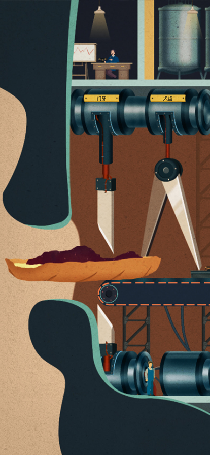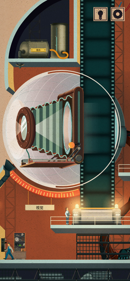 3、它将人体的生理机制用工厂和小人的方式呈现出来——经理坐在位于大脑的办公室里,流经四肢和器官的通讯线缆把各个“部门”串起来。玩家戳屏幕来观赏工人们运转机器:用滑轮抬起眼皮,撑大瞳孔让光照进来,看细菌如何经过鼻腔过滤被消灭大半,而牙齿变成了切割机。