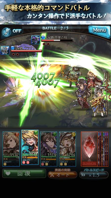 《碧蓝幻想》继承了《最终幻想》的血统,玩法也有些类似。游戏采用了传统的回合制4人战斗,与其他游戏的卡牌不同,《碧蓝幻想》中的玩家角色就如传统的《最终幻想》一般立于屏幕右侧,刀剑的打击感也很到位。玩家既可以进行简便的一键攻击,也可以手动释放奥义、连携攻击等独特攻击技能。不得不提的是游戏的卖点之一,召唤星晶兽,就像《最终幻想》中的巴哈姆特、奥丁等召唤兽一样,星晶兽具有一发撼动全局的效果,其召唤动画也同样华丽至极。