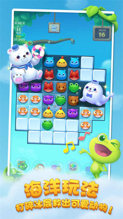 滑动手指让三个及以上的同色小动物横竖相连即可消除,完成每关的指定消除目标即可过关!