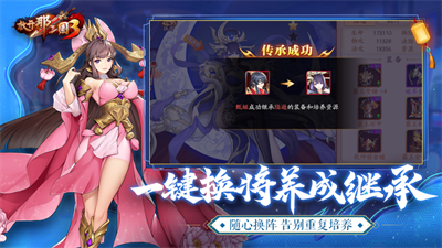 1、无需担心重复培养武将的问题,点击“换将”即可将目标武将更换上阵,同时继承被更换武将的装备、进阶、等级等养成资源,轻松搭配出多种作战流派阵容以应对不同敌人。
