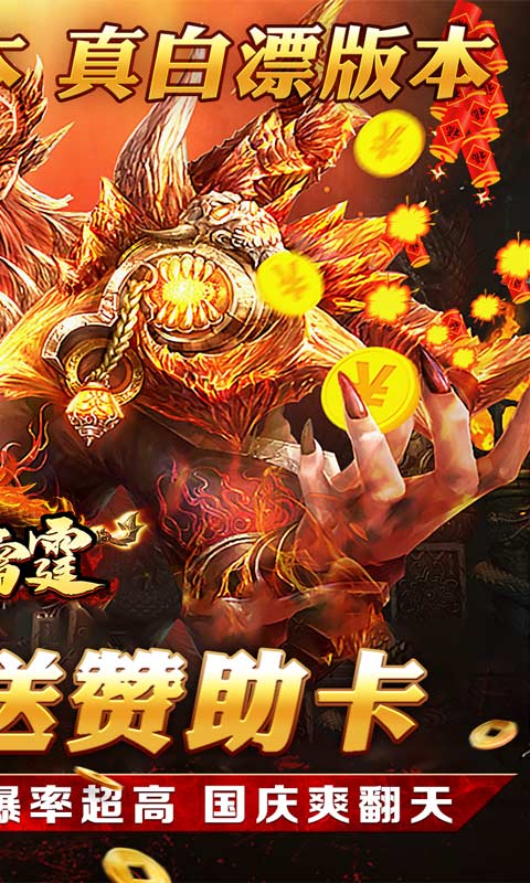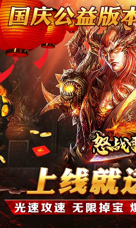 一款专为庆祝国庆假期的单职业超变传奇手游,上线送万能充值卡免费激活赞助、每天送充值,打怪爆货币。超高爆率,刀刀光柱,散人称王,国庆最爽版本!