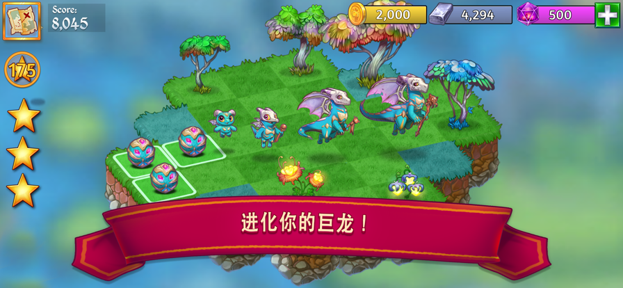 6、匹配蛋来孵化有用的巨龙,然后进化它们,让其变成更加强大的巨龙!搞定极具挑战性的谜题关卡:匹配盖亚雕像来获胜,然后将奖励带回你的大本营,收集并进行种植。