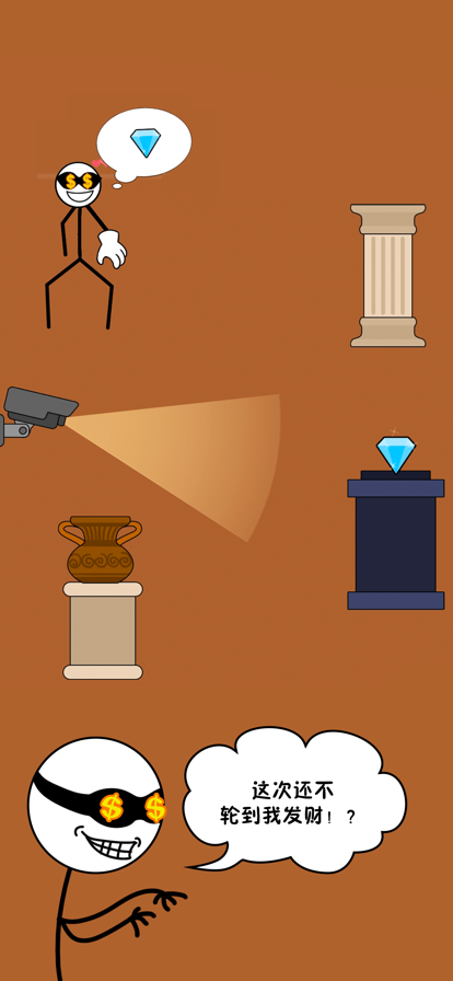 2、这是一款非常有意思的游戏,快看他又在打什么坏主意了,他的手贼长,一不小心你的东西可能就不见了,小心保护好你的随身物品哦。游戏玩法趣味十足,整体以火柴人为形象,操作简单,点击即玩