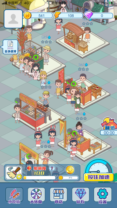 3、吃货的福利,为所有吃货打造的模拟经营游戏,轻松挂机,所有吃货心中梦想的小吃街,你只需要无限升级你的摊位,就能轻松掌控这个游戏。