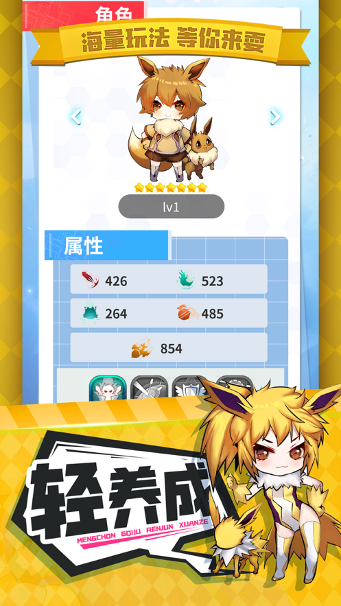 2、精美的二次元卡通风格设计,展现给人们一个非常奇幻的世界,众多精灵等你来捕捉。