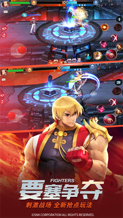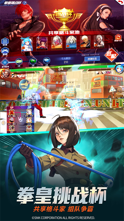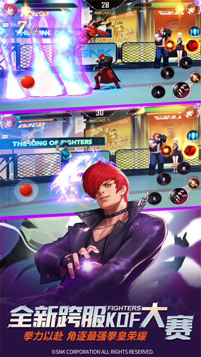 跨服大擂台,实时匹配,真人对决,无数值加成,胜负全靠操作,从任性青铜起步,逐步攀升到至尊拳皇,摘取全服第一荣誉!自选3名格斗家组队,迎战各种打法的对手,硬刚流、POKE牵制流、跑酷流、强控流……土豪和平民在KOF玩法中没有差别!是时候展现真正的技术了!