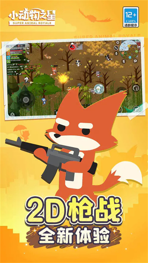 由Pixile授权,创梦天地自主研发的海外超好评的战术竞技游戏《小动物之星》终于来了!狐狸、兔子、小熊等百余激萌小动物任你选,千种丰富装扮任你挑,打造属于你的个性小动物!游戏中你将与其余63名玩家一起,乘坐巨鹰飞船进入大型动物园,这里有麦田,竹林,河流,沼泽,雪地,森林、海边、冰原等多种地形环境供你探险,搜集装备,利用仓鼠球、香蕉皮等欢乐道具,与好友并肩作战成为最终的小动物之星!