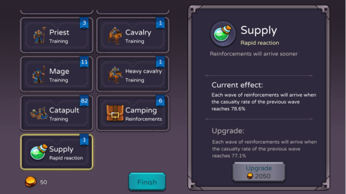 除了步兵以外,玩家可以逐渐完整弓箭手、牧师、轻骑兵、法师、重骑兵、燃火投石车搭配部署;
