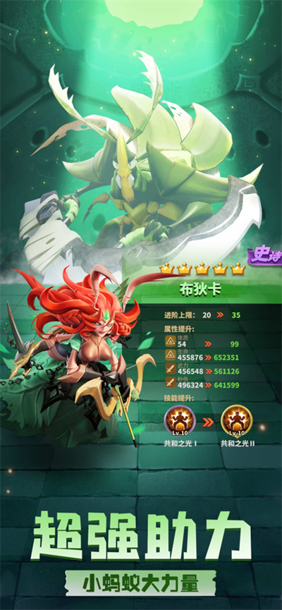 1、统帅战令一下,蚁族军团火速出击;各类生物入侵家园,英雄驻地守卫家园。你可以带领蚁族军团四处征战,收复城市;探索各类资源,挖掘各级宝洞……一个强大的统帅就要靠实力说话!英雄已就位,就等统帅带领我们争霸庭院!