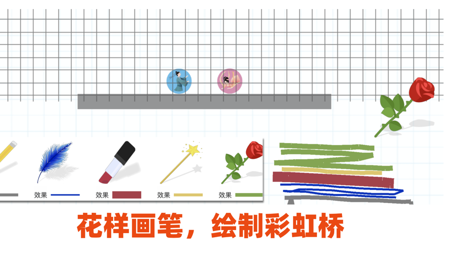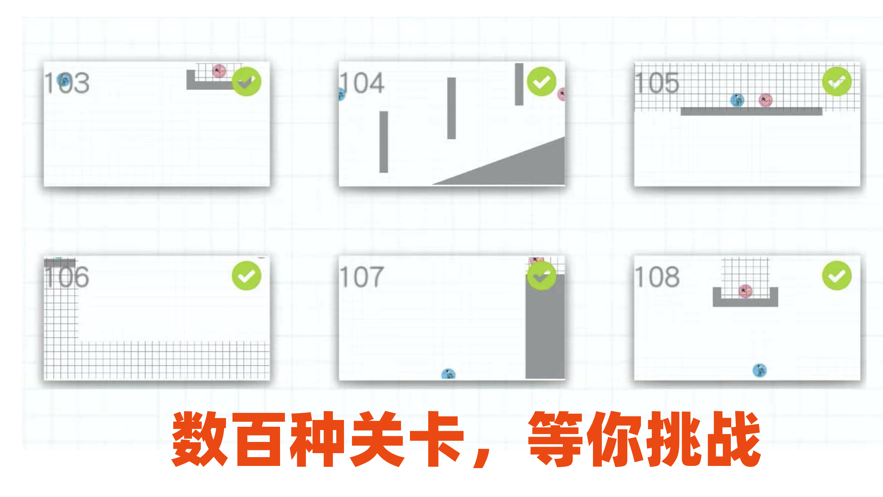 6、挑战内容非常简单,只要想方设法将两个圆球碰到一起就行,操作起来也并不困难,我们通过手指按住屏幕滑动来画出某些图形或者物体,当松手以后这些物体就会按照严格的物理定律进行移动,要么落下、要么倾斜等等,通过画出的物体来帮助小球能进行移动,从而碰到一起。游戏操作上非常简单,只是需要注意某些角落或则死角的时候无法继续延长画线,所以每一次画线之前都好考虑好路径问题。