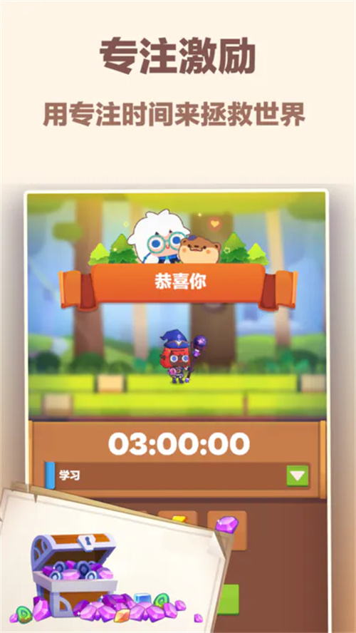 《时间大冒险》是一款以”放下手机的时长“来驱动的RPG游戏,专注的每一分钟都将强化你的英雄,拯救专注王国!我们想要通过游戏的趣味和黏性帮助你培养”放下手机“的习惯!