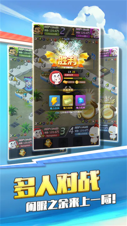 玩家在游戏中通过购买地块,加盖楼盘,道路建设等方式赚取货币赢得冠军。数十种道具组合使用,足以逆风翻盘绝杀对手。玩法休闲又不失策略,更可经营美少女人脉,携带不同美少女人脉可以让你在起步阶段就领先别人。