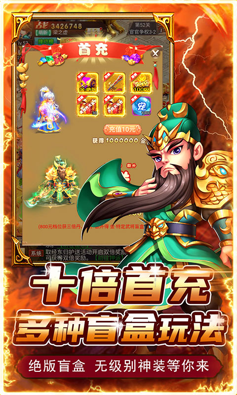 满VIP12、800w元宝、1亿银两、648元金条红包、金·绝版武将凭证*5、金·特定武将凭证*8 注:邮件内领取 1.上线即可领取满V12.VIP礼包免费领! 2.科技送充兑换超值首充礼包! 3.十倍首充助力,绝版武将盲盒、无级别神装等你来! 4.绝版盲盒、碎片盲盒、全局盲盒等诸多盲盒玩法来袭! 5.每日礼包活动领金·神品武将盲盒、绝版盲盒等超强道具! 6.天天登录领超强战力金将!