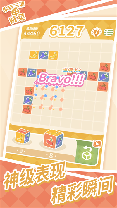 以展开一个六面体的方式逐步点击放置六个面,拼凑同色达成消除!