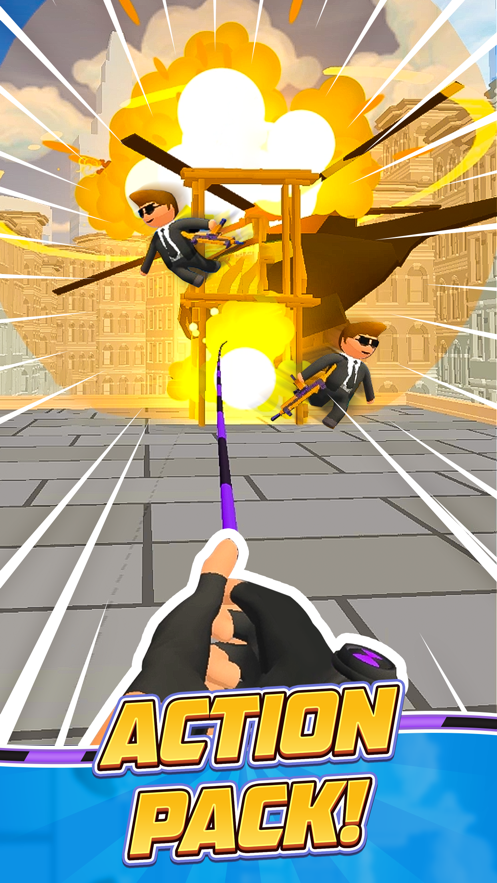 2、射出钩子,拖拽直升机、建筑物,还有那些坏蛋,然后再把他们扔出去,完成每一个关卡。