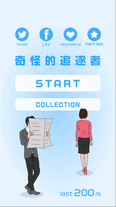奇怪的追逐者是一款奇葩的休闲益智游戏,游戏中只有男主和女主两个人,玩家要扮演男主,在女主的身后默默尾随,同时想尽各种办法不让她怀疑你在跟踪她,比如在她回头时,立刻伪装成电线杆、奥运选手、稻草人等事物,等她转身继续往前走,你就接着尾随,直到被她发现你在跟踪或着她没转身而你伪装了,游戏则结束。奇怪的追逐者玩法另类独特,画面搞怪有趣,空闲无聊时玩一下还是挺有意思的。