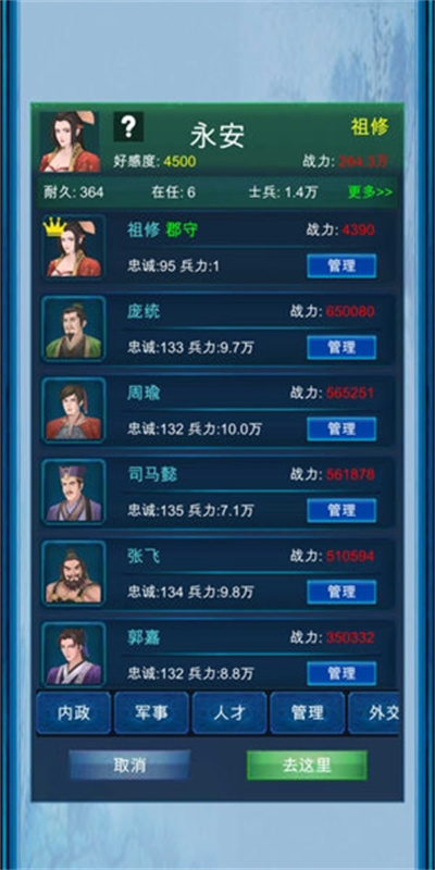 2、您可设置包括内政、军事、人才、管理、外交、计谋等近30个命令;