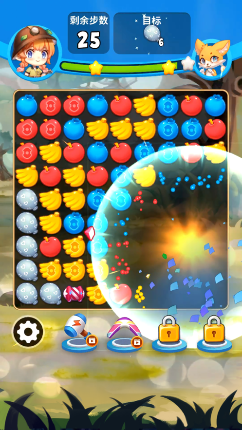 11、全新创意消除游戏,匹配相同颜色的水果元素,创造范围巨大的道具组合;解决困难重重的关卡,邂逅可爱友好的动物朋友们;即刻开启一场神奇的探险之旅~!