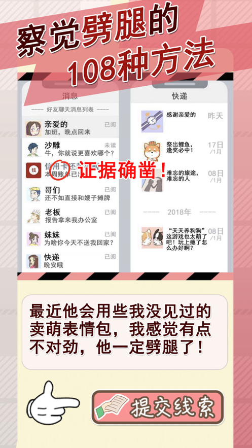 2、游戏主要是通过阅读情节来获得线索,并寻找男女出轨的证据。