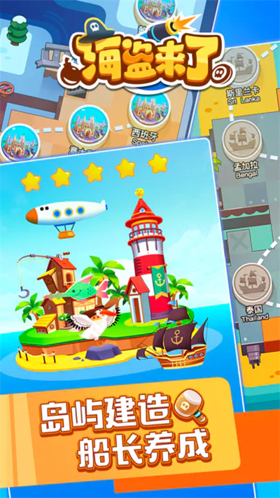 海盗来了是一款社交休闲策略游戏,玩家在游戏中扮演一名船长,通过不同方式攫取资源来占领岛屿。