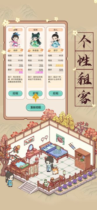 古代的收租经营模拟游戏,游戏含有浓厚的古代特色,同时以古代的盛世为背景。在游戏中玩家们可以建造各种不同特色的房屋街道店铺等,然后根据不同的级别的顾客来安排合适的房间。模拟当房东,开启你的收租生活。