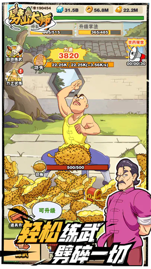 《劈山大师》是一款模拟功夫修炼的休闲放置游戏!你将扮演一名功夫大师,摧毁各种神奇的道具,锻炼身体各个部位,成为人间兵器,劈开华山!期间你还能开设武馆,自创绝学,招收弟子,延续传承,成为闻名天下的劈山大师!