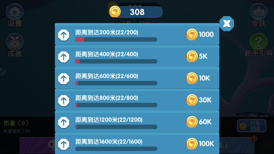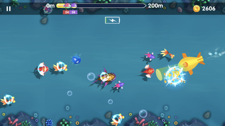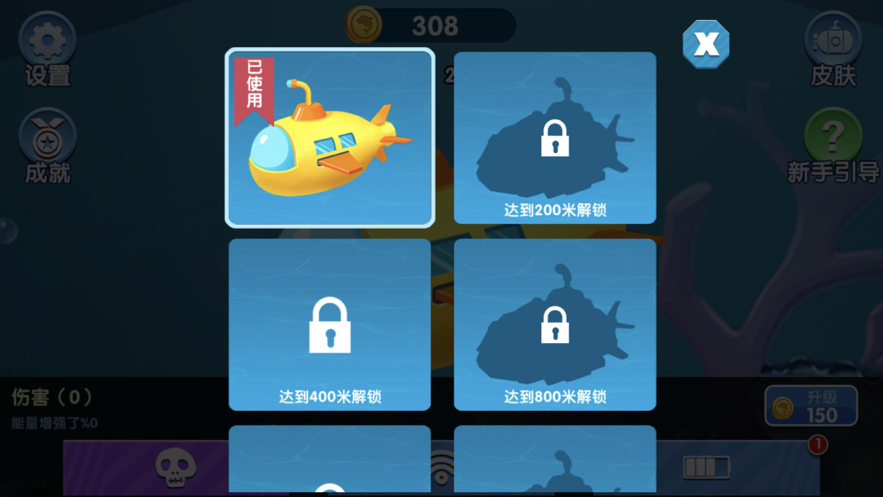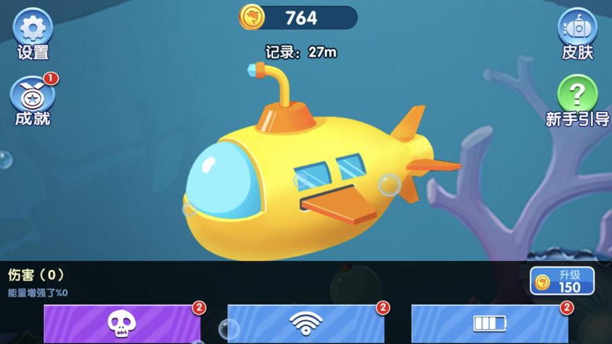 4、新奇好玩的升级策略;游戏通过玩家向前移动的距离来确定等级,而不同的等级可以使用不同等级的潜艇并获得不同伤害值的镭射装置。