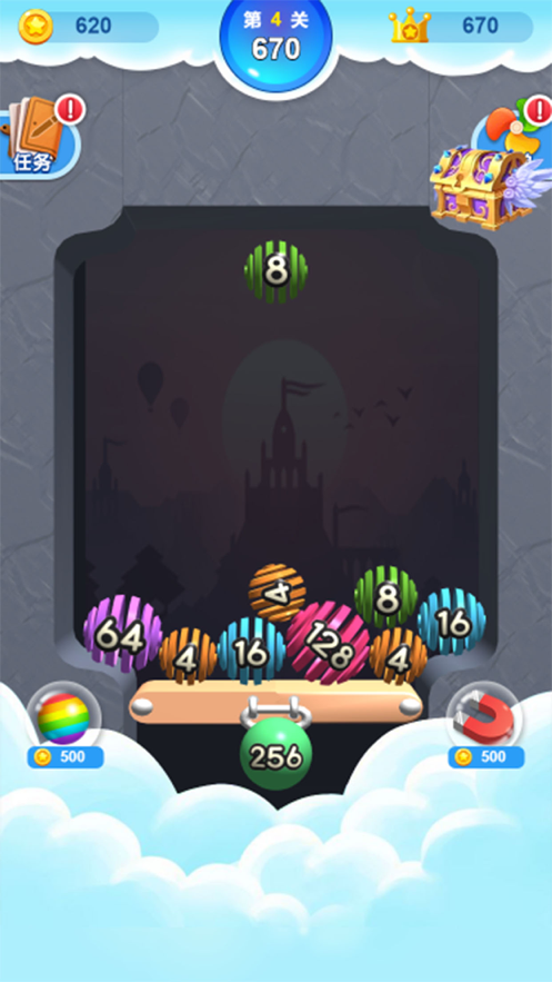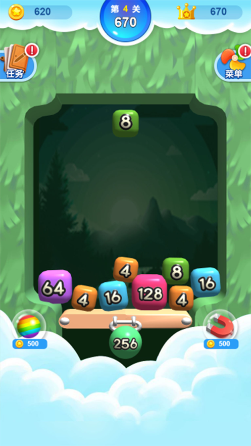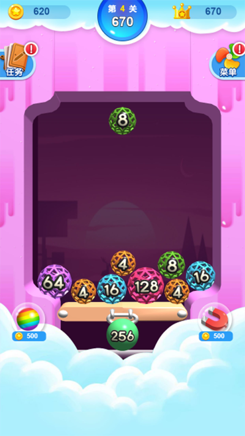1、不断选择相同数字的小球进行合成,并且组成最大的数字2048即可快速消除;