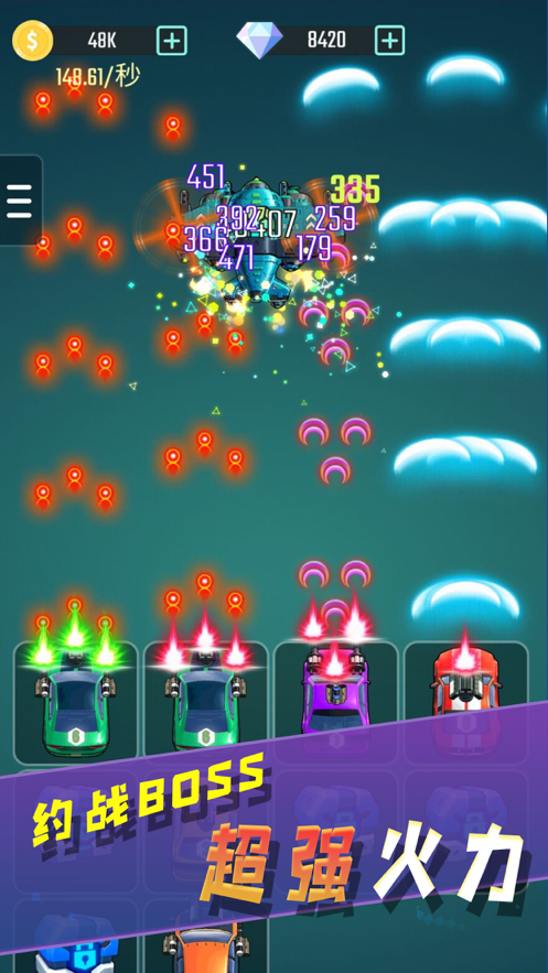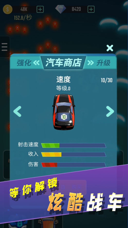 5、这是一款休闲合成汽车挂机射击的游戏,游戏中各式炫酷战车,激爽射击效果,满屏福利,给你不一样的射击游戏体验!