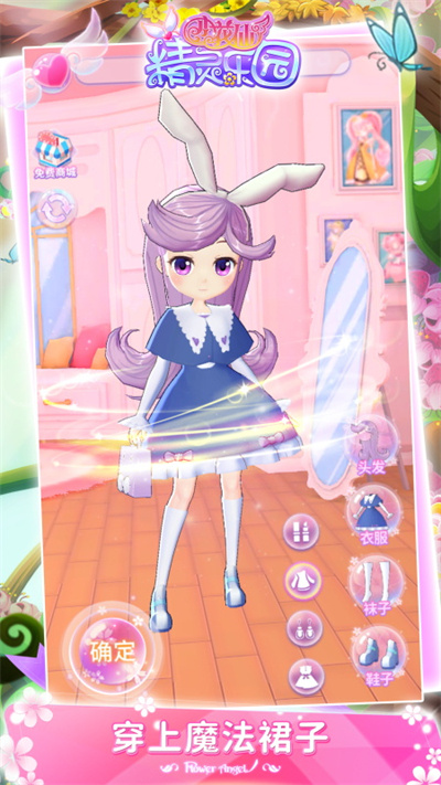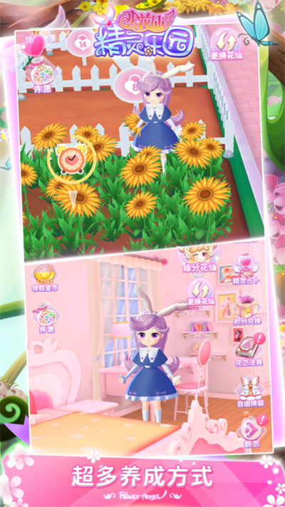 2、装扮,玩家不仅可以装扮精灵们,还可以装扮梦想花园,让她们能更加自由无虑的生活,你还可以向你的好友展示你的装扮成果。