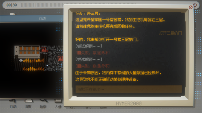地图上存在一些损坏数据导致道路不通,这时玩家需要利用游戏中的“检索”功能修复数据以修复地图。“检索”功能相当于一个小型数据库,包含了80段海默2000与其他角色的对话记录。这些内容一开始是隐藏的,当玩家在游戏进行中猜测某些词汇可能是关键词时,就可以检索其是否出现在这些记录当中并进行查看。查看记录,修复地图的同时,玩家也将了解到希望家园里更多的故事。
