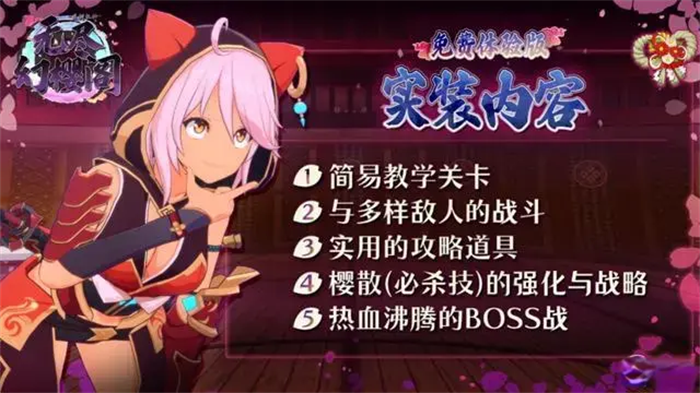 当「花岚踊值」超过 100% 时,即可发动「花岚踊」,释放威力强大的必杀技「花岚樱散」。在本次免费体验版中,玩家將沿著楼层阶梯一路向上,挑战最终楼层的Boss战,并在通关后结束体验。