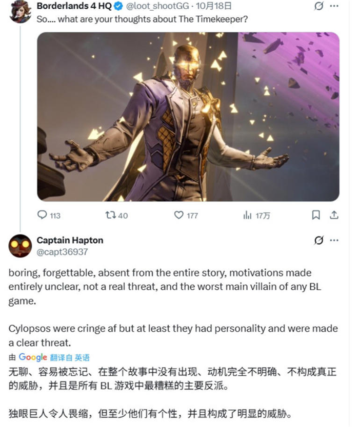 曾备受期待的《无主之地4》在发售一个多月后陷入了一场严重的口碑危机。PC Steam版玩家数量暴跌85%,销售动力明显不足。为刺激销量,2K公司被迫采取降价促销策略,却引发了首发玩家的强烈不满,大量玩家在Steam平台打出差评,认为自己遭到“背刺”。与此同时,游戏在海外社交媒体上也引发激烈批评。一条关于游戏大反派“时间尊者”的推文成为玩家宣泄失望情绪的窗口,众多玩家指出该角色设计失败、缺乏特色,甚至远逊于《无主之地3》中的兄妹反派。