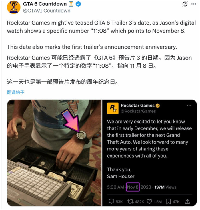 关于《侠盗猎车手6》(GTA6)第三支预告片发布时间的推测在玩家社区中引发热议。有推主指出,游戏中角色杰森的数字手表显示为11:08,这可能暗示新预告片将于11月8日发布。